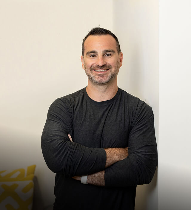 Kevin Shkolnik of Quandrant Leadership smiling with arms crossed, wearing a dark long-sleeve shirt against a light wall.