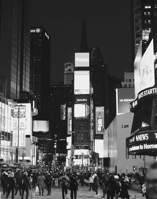 Black-and-white nighttime view of Times Square with crowds, illuminated billboards, and towering skyscrapers.